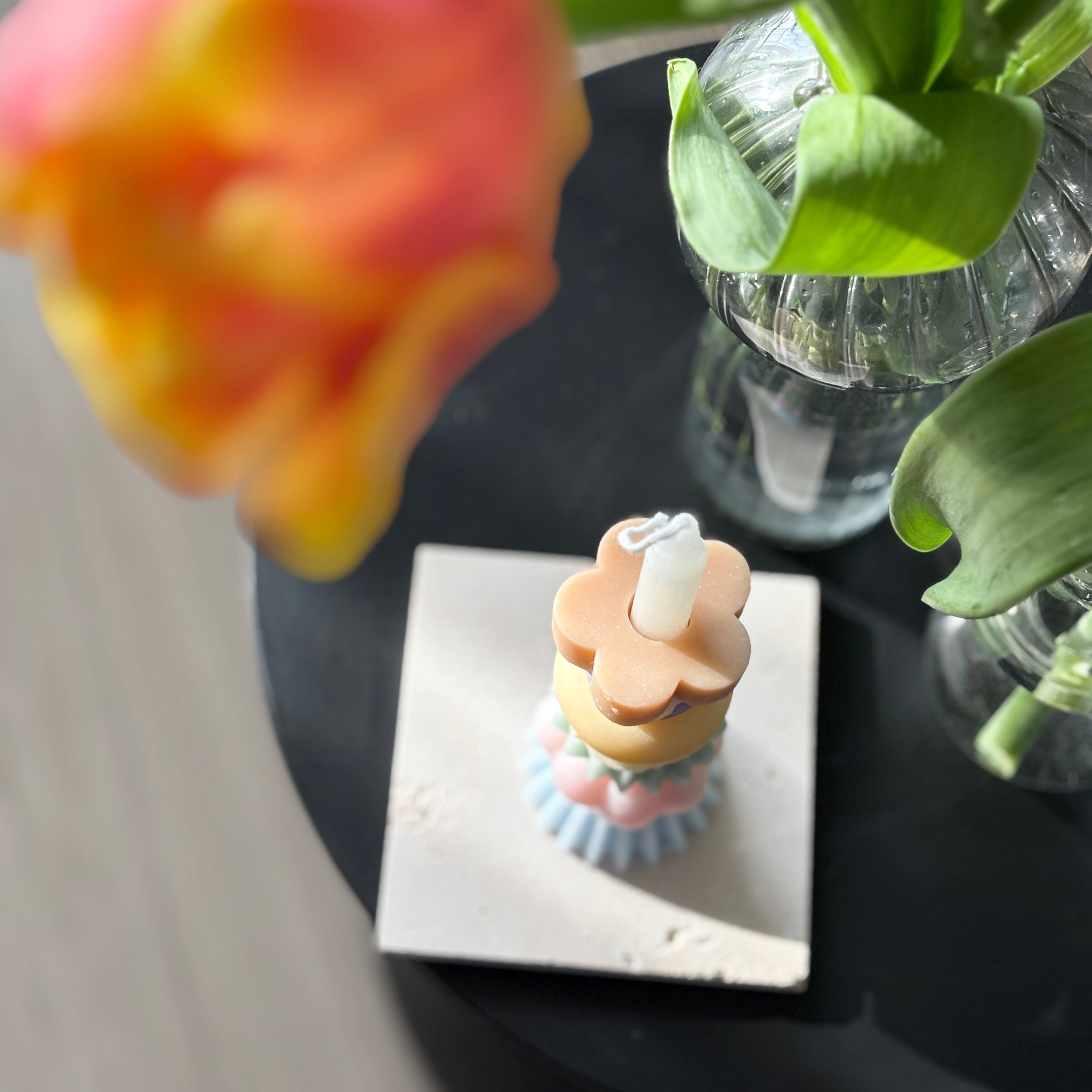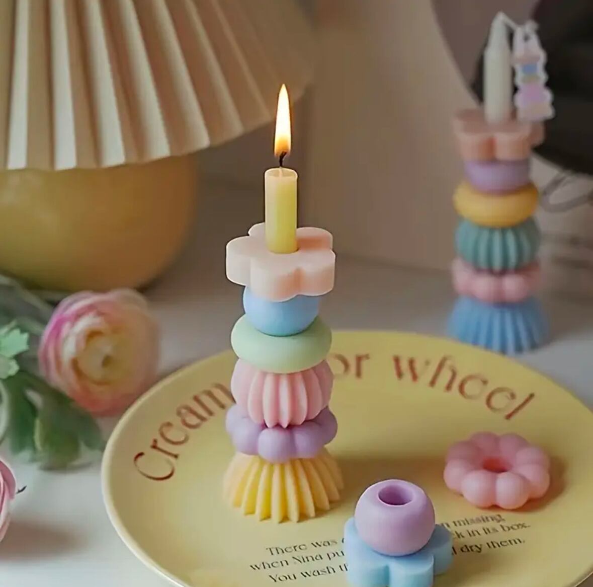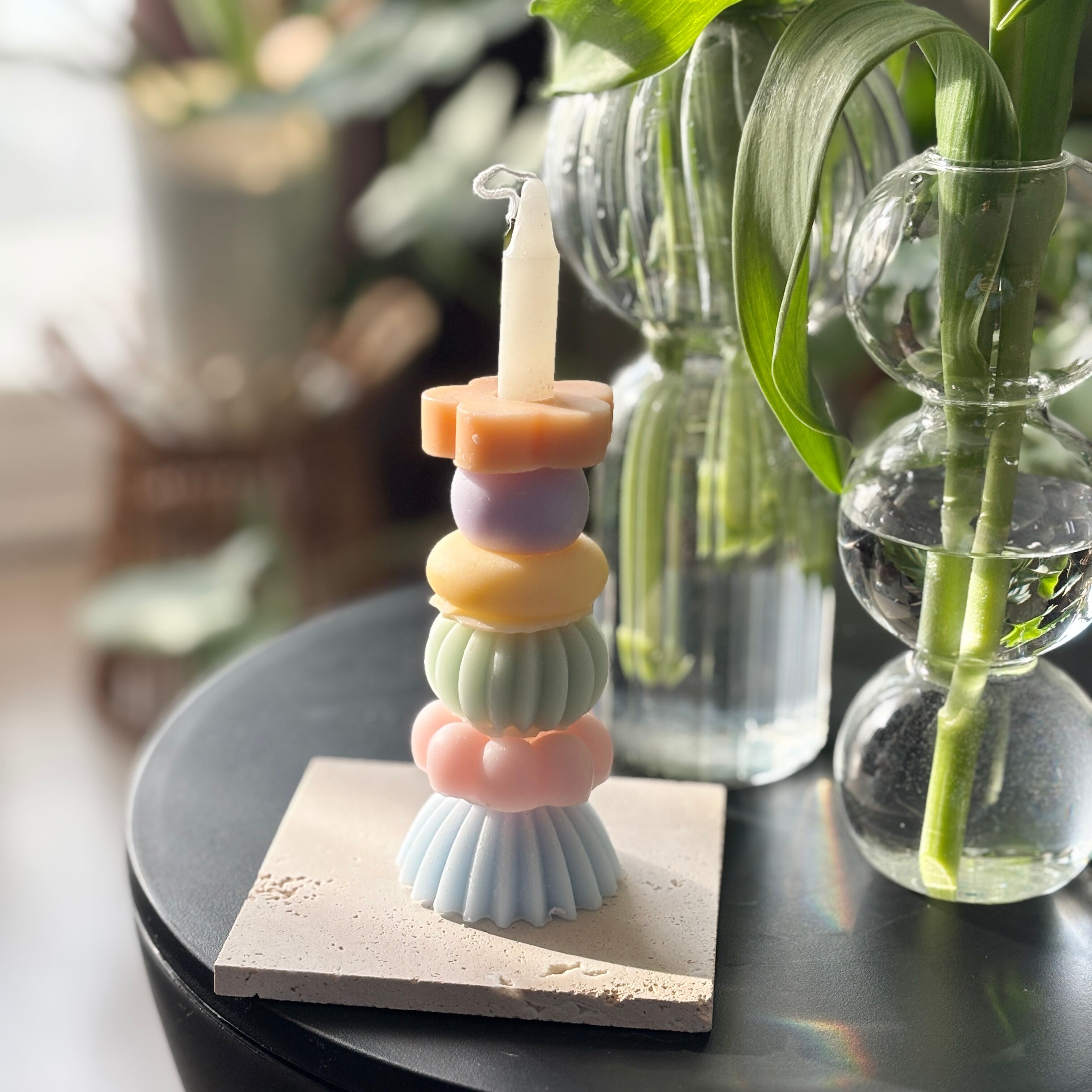 アートピースが積み重なった、可愛いデザインが特徴のキャンドル。